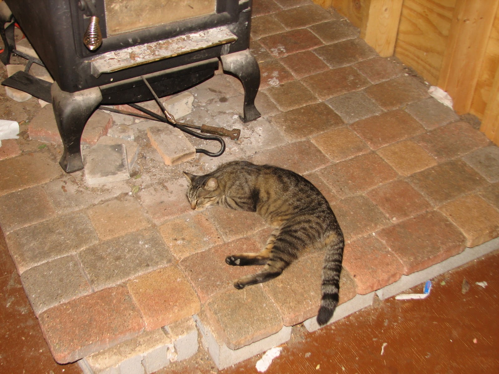 Jade comes in from the heat and lays down on the cool bricks of the hearth. She's hiding from her four kittens, I suppose.